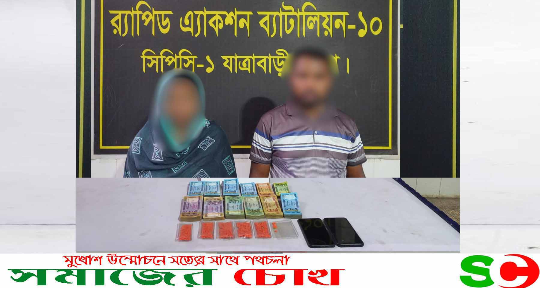 বুধবার (১৭ সেপ্টম্বর) বিকাল ১৫.৪৫ ঘটিকায় র্যাব-১০, সিপিসি-১, যাত্রাবাড়ী ক্যাম্প এর একটি আভিযানিক দল গোপন সংবাদের ভিত্তিতে ডিএমপি, ঢাকার ডেমরা থানাধীন সারুলিয়া এলাকা হতে অনুমানিক ৩,০২,৭০০/- (তিন লক্ষ দুই হাজার সাতশত) টাকা মূল্যমানের ১০০৯ (এক হাজার নয়) পিস ইয়াবাসহ ০২ জন মাদক ব্যবসায়ীকে গ্রেফতার করে। গ্রেফতারকৃত মাদক ব্যবসায়ীদের নাম ১। মোঃ জসিম উদ্দিন (৪০), পিতা- মুক্তল হোসেন, সাং- শাহপুর, থানা- কুমিল্লা আদর্শ সদর, জেলা- কুমিল্লা, ও ২। কেয়া আক্তার (২০), পিতা- শেখ মোঃ কবির, সাং- সাবিয়া রামপুর, থানা- নাসিরনগর, জেলা- ব্রাহ্মণবাড়িয়া বলে জানা যায়। এসময় তাদের নিকট হতে মাদকদ্রব্য ক্রয়-বিক্রয়ের নগদ ৩,০৪,১০০/- (তিন লক্ষ চার হাজার একশত) টাকা উদ্ধার করা হয়।